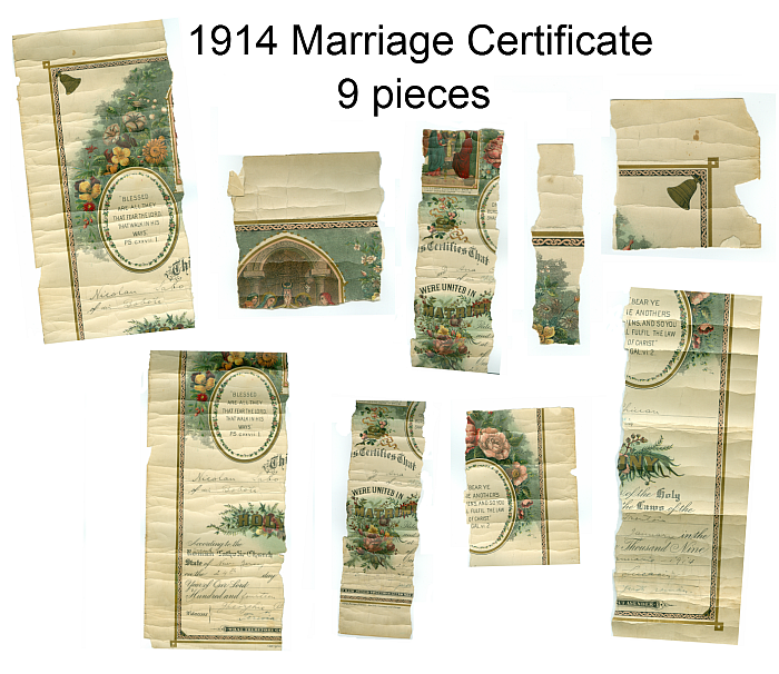 Over 107 years old... can it be restored??? A1 Video was able to even amaze our selves with this project. ![]() This is a Marriage Certificate dated from 1914. It had been ripped up in pieces, rolled up and placed in a zip lock bag. Depending on the amount of detail correction and changes needed, the cost will vary. Photo sizes upto 8 X 10 will be scaned and detailed to your request then printed on quality photo stock paper. Scroll down for other examples |